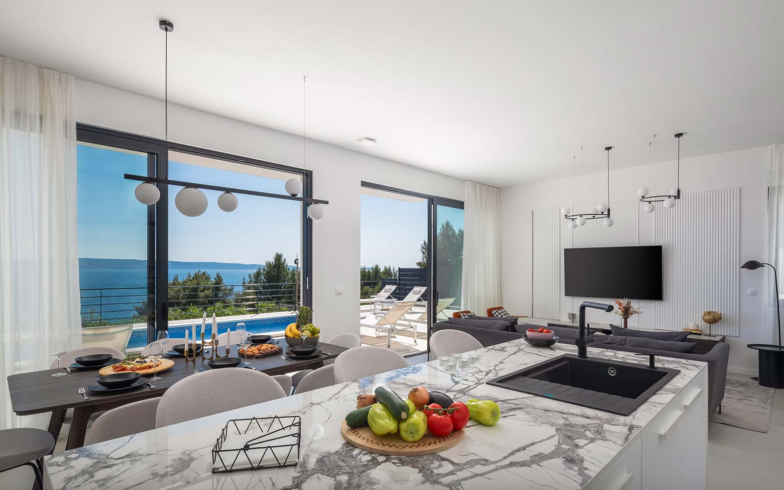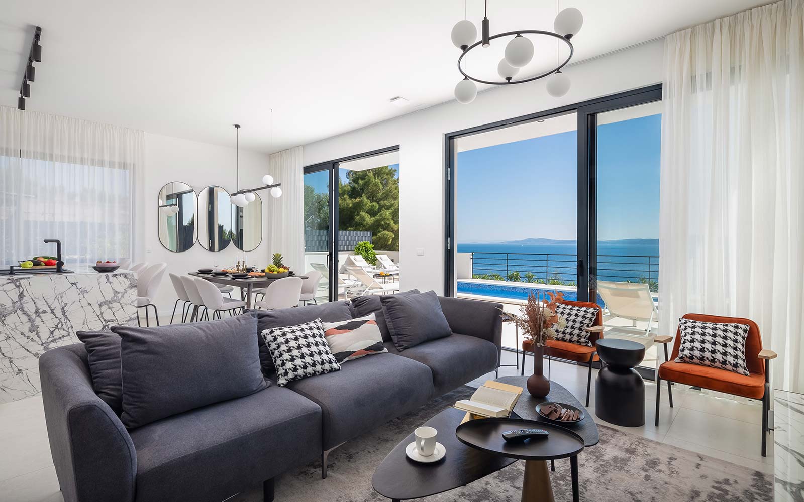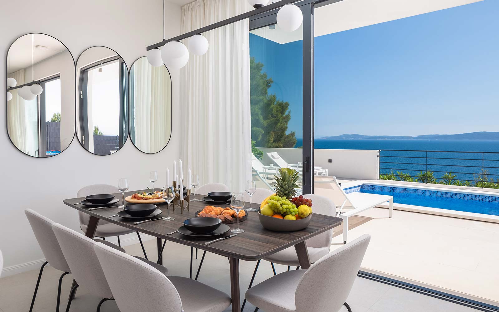 Get to know the luxury of Villa Olive through pictures that reveal every corner of this exclusive residence on the island of Čiovo. Take a walk through our elegantly decorated rooms, explore the modern bathrooms, enjoy the luxurious kitchen and relax in the spacious living room.